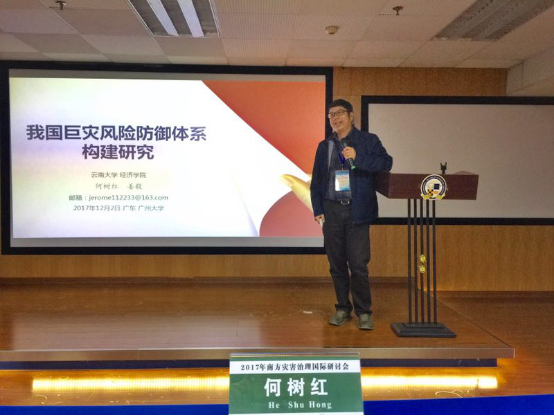 12月2日至3日,以“变革时代的灾害治理”为主题的2017年南方灾害治理国际会议在广州大学隆重举行。永利官网何树红教授应邀参加了会议,并在会上做了题为“我国巨灾风险防御体系构建研究”的报告。