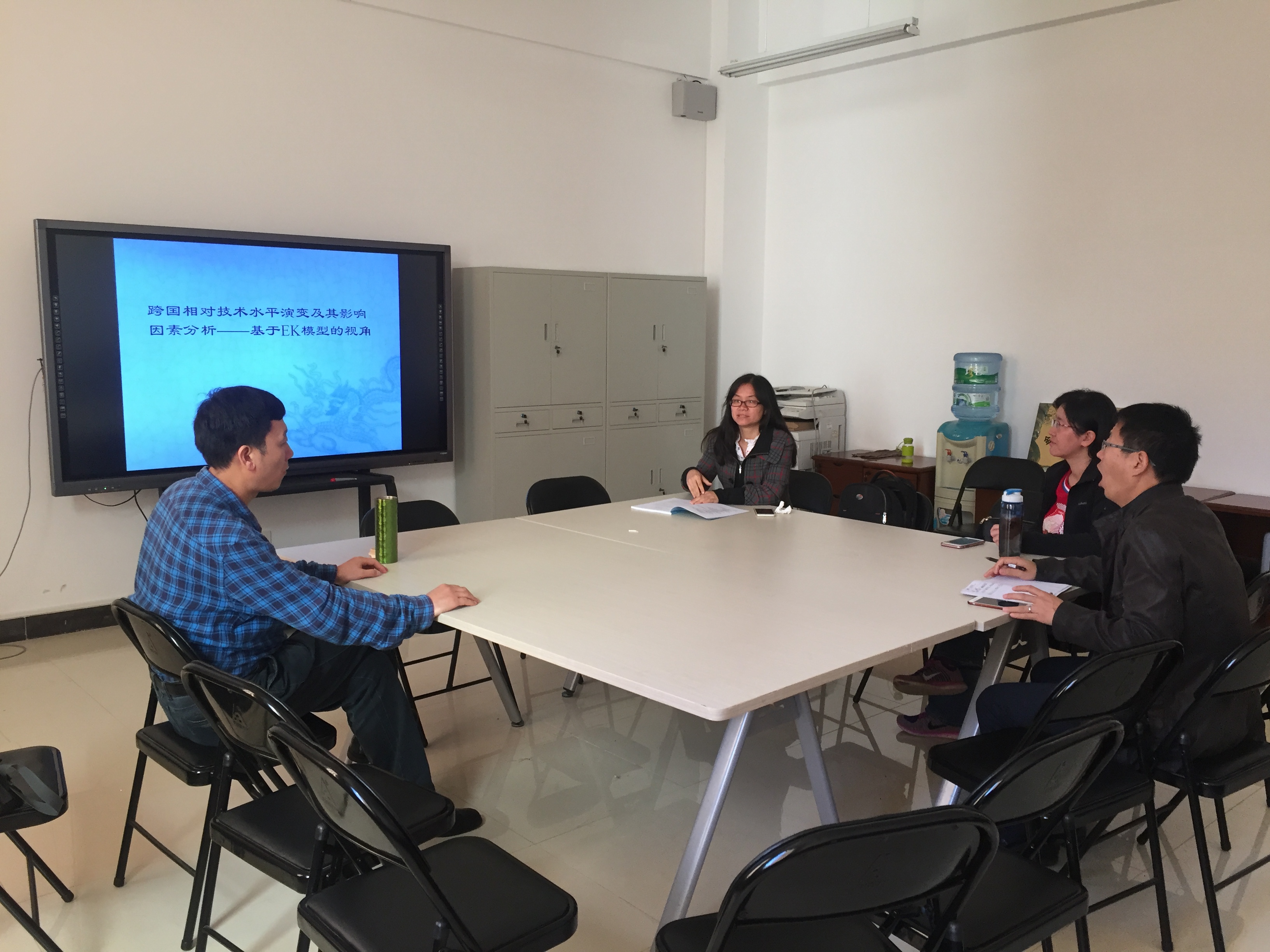 10月21日上午8点45分,yl7703永利官网一带一路团队在学院二楼会议室召开了本学期第三次学术讨论活动,由段亚丁老师做了题为“跨国制造业相对技术水平的估计与影响因素分析”的学术报告。内容以段亚丁老师2015年10月在《财贸经济》期刊上发表的文章为基础,重点介绍了国际贸易理论的新模型——EK模型及其拓展、用实际数据进行计量分析的方法和结果以及政策建议,并就如何选题、处理数据等问题分享了相关经验。