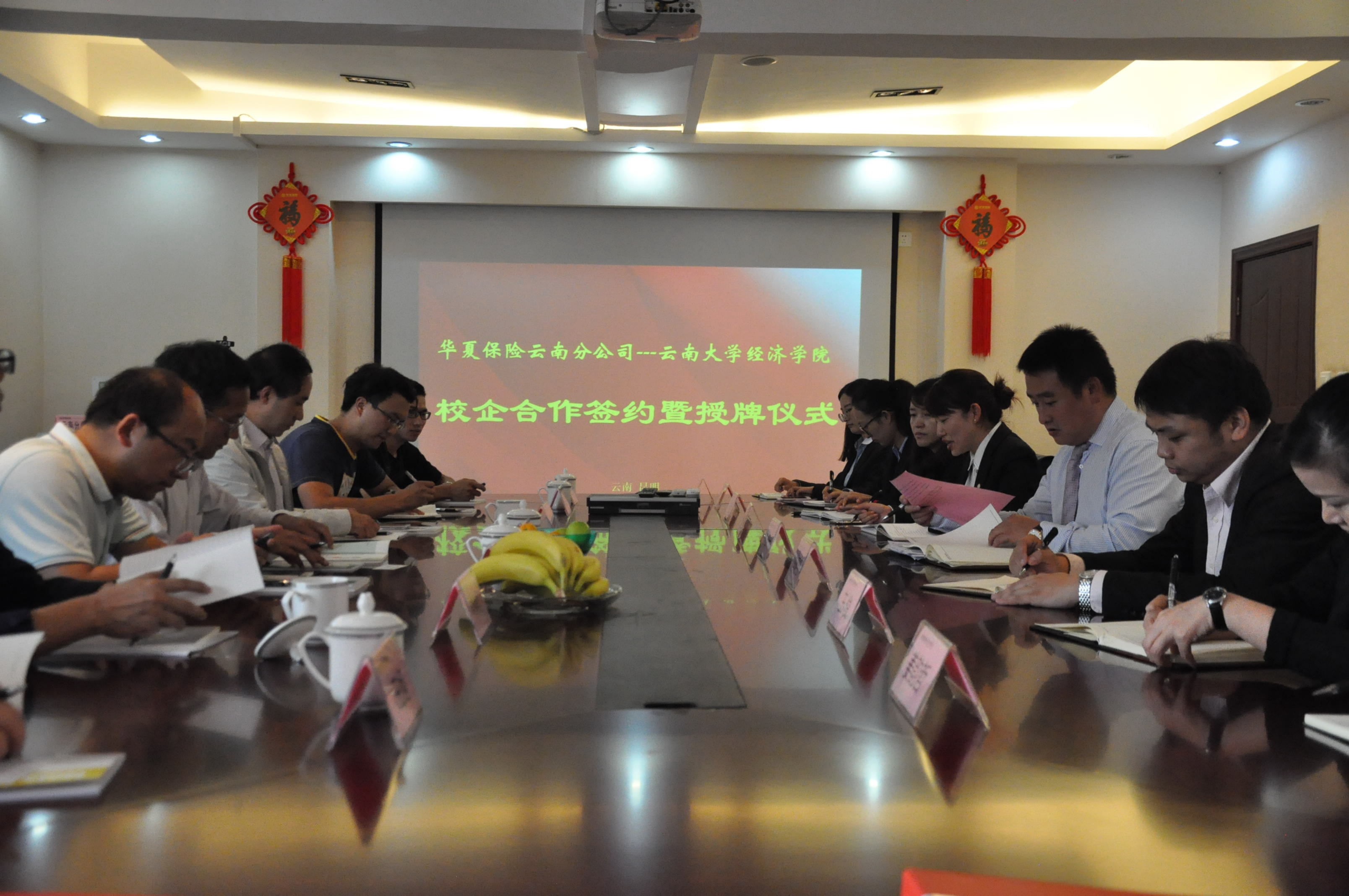 10月25日下午,yl7703永利官网(会计学院)与华夏保险云南分公司校企合作暨签约授牌仪式在华夏保险云南分公司四层大会议室举行。永利官网党委书记、院长梁双陆,副书记马子红,金融系主任李贤、保险系教授何树红,团委书记李振东等出席签约授牌仪式。华夏保险云南分公司党委书记、负责人王一及华夏保险云南分公司孙玥、李明翔、何蕾等各部门负责人与会。