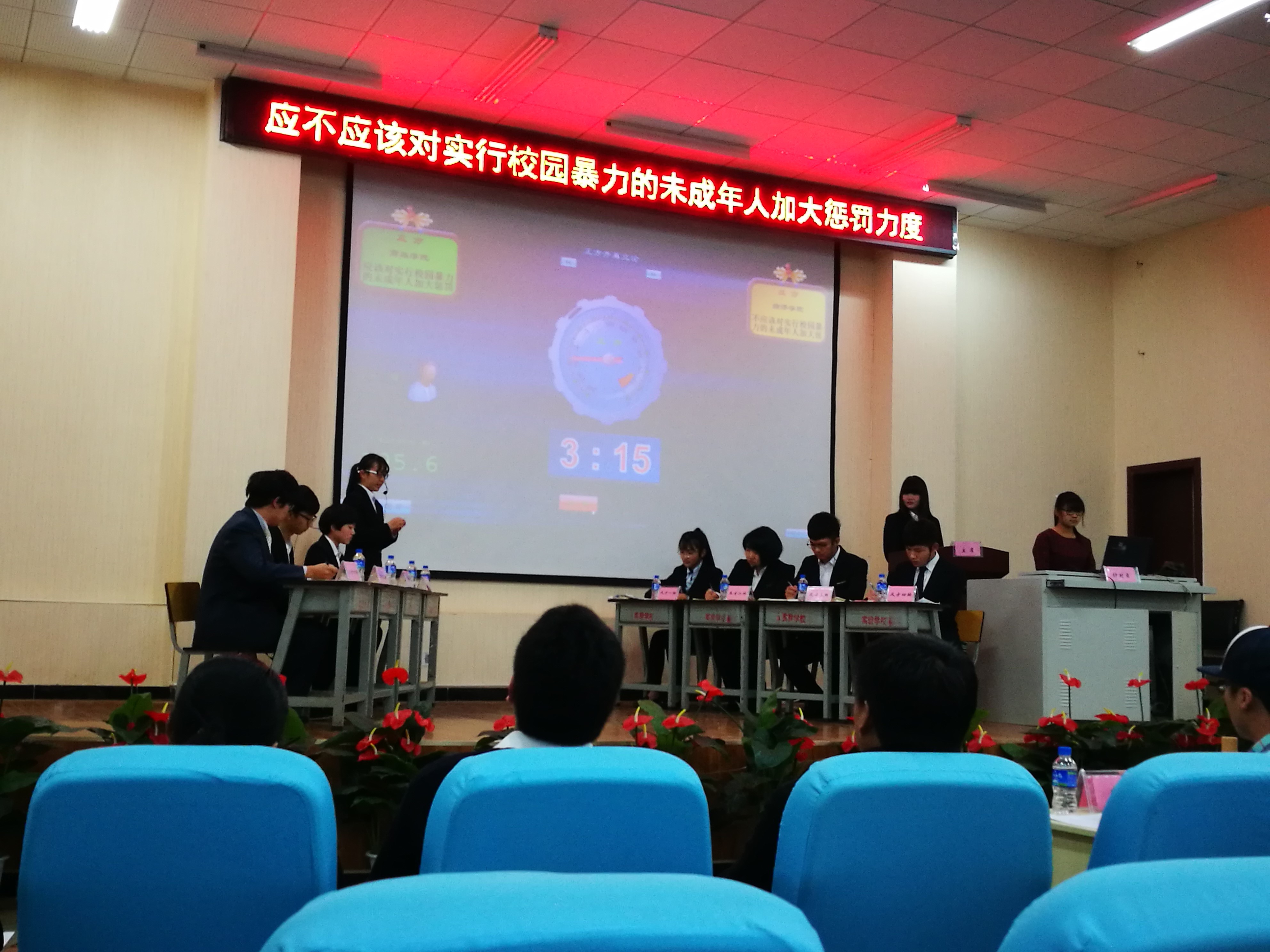 法治辩论赛是呈贡区未司办今年青少年法治宣传进校园的另一种形式。在呈贡团区委的指导下,与yl7703永利官网法学院团委学生会合作,由yl7703永利官网法学院主办的以未成年人违法犯罪主题为辩题的校级辩论赛,以期通过双方的陈述和争论,使观赛学生清晰直观地看到校园暴力的危害、国家司法的严肃和国家对未成年人的特殊保护,从而珍惜在校学习机会,明确违法犯罪行为,恪守法律底线。