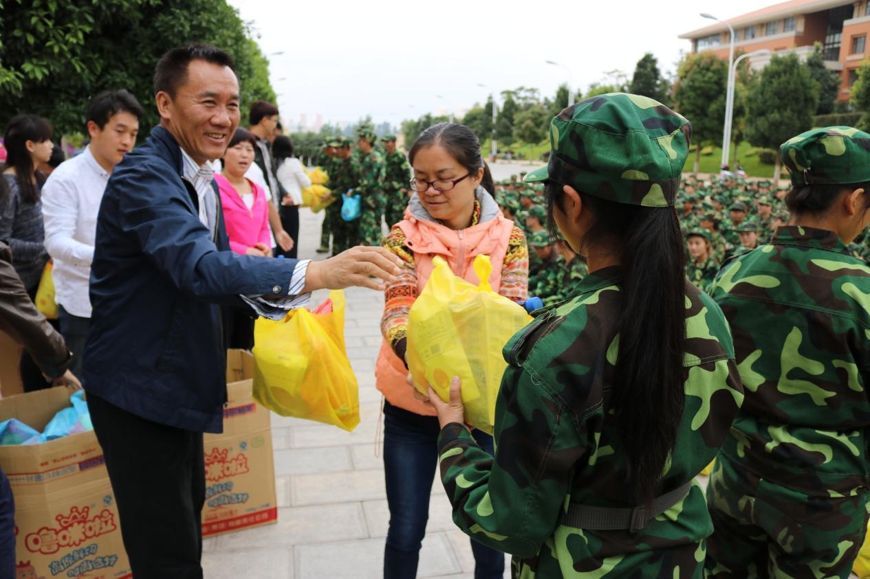 日上午十点半,经济(会计)学院院长施本植、党委副书记李娟、各年级辅导员和新生班主任以及院团委学生会主要学生干部们,带着一箱箱慰问品来到百家大道训练场慰问新同学。老师们提前就做好了准备,几十箱慰问品整齐有序地排放在路边,便于大家领取。十五分钟后,我们呈五路纵队,在教官的带领下迈着整齐的步伐踏入场地。