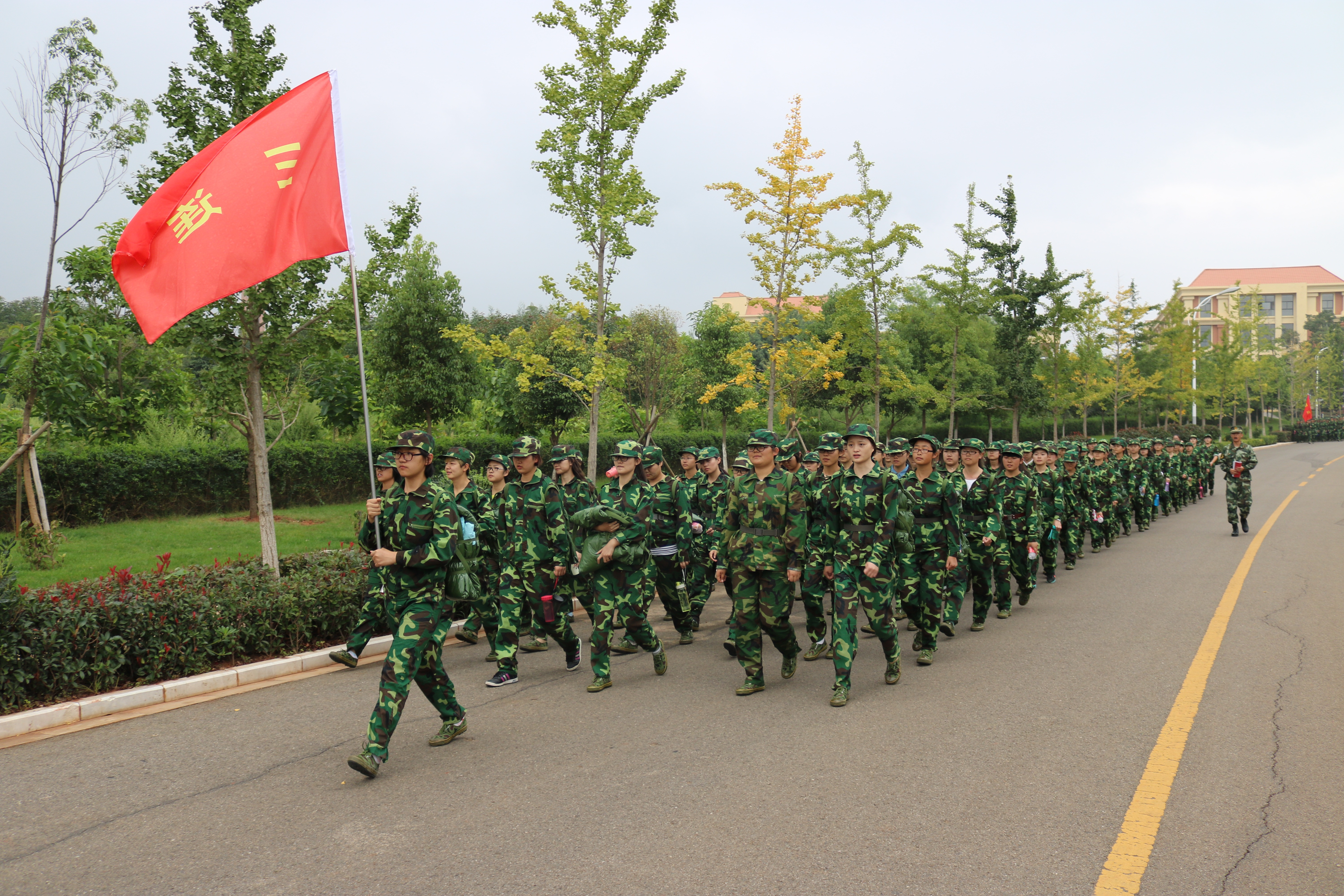 一抹迷彩,一袭军绿;一抹汗水;一腔热血。早晨出操,上下午训练,傍晚拉歌。为期两周的军训生活让我们经历了欢笑和泪水,磨砺了身心和意志。我还记得那次环校行军拉练,汗水浸湿了发丝,迎着蒙蒙细雨,我们身背军绿的行囊,随着浩荡的部队徒步行走于云大校园;我也记得那次蹲姿训练,尽管大腿已经酸痛失去了知觉也没有人喊苦,泪水被狠狠的吞进肚子;我也记那次军拳集训,“杀杀杀”的口号震天响,直摆勾击,抓腕砸肘,动作干脆利落。尽管皮肤镀上一层古铜色,嗓子变得沙哑疼痛,然而我们也收获了坚强;懂得了担当;结下了友谊,体味了成长。