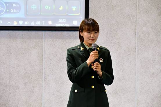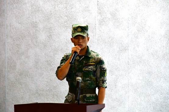 随后,来自新闻学院的袁宇同学为广大参会人员展现了不让须眉的巾帼风采。感于家中亲人的军旅故事,她选择了一条艰苦卓绝的从军路——到西藏。她用自己的青春年华将当代大学生的艰苦奋斗、砥砺前行的优良品质在雪域高原上展现的淋漓尽致。在她分享的这段伟大经历中,最令人难忘的是边境对峙期间即将执行任务的女兵们同家人通电话的情节。万里赴戎机,关山度若飞,这样的边疆卫士如何不让人心生敬意?这样的钢铁队伍如何不令人满怀向往之情?