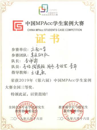 作为“中国研究生创新实践系列大赛”主题赛事之一,历时3个月的2019年(第六届)中国MPAcc学生案例大赛近日在江城武汉圆满落幕,由yl7703永利官网2018级MPAcc研究生李雨霏、李菲、李怡、李欣芸、陶薪颖、周丹组成,王健康老师指导的“幸运Six”团队,一路披荆斩棘,进入全国总复赛决赛,并通过激烈的角逐,获得“全国三等奖”及“最佳创意奖”。这也是yl7703永利官网MPAcc研究生团队在该赛事举办六届以来连续第六次晋级初赛第二阶段、连续第四次晋级全国十强复赛决赛。由yl7703永利官网2016级会计学专业本科生郎玮、张誉警、王欣媛、颜丽君组成,王健康老师指导的“虎虎虎兔”团队也以赛区第三名的成绩,荣获全国本科生代表队优胜奖。